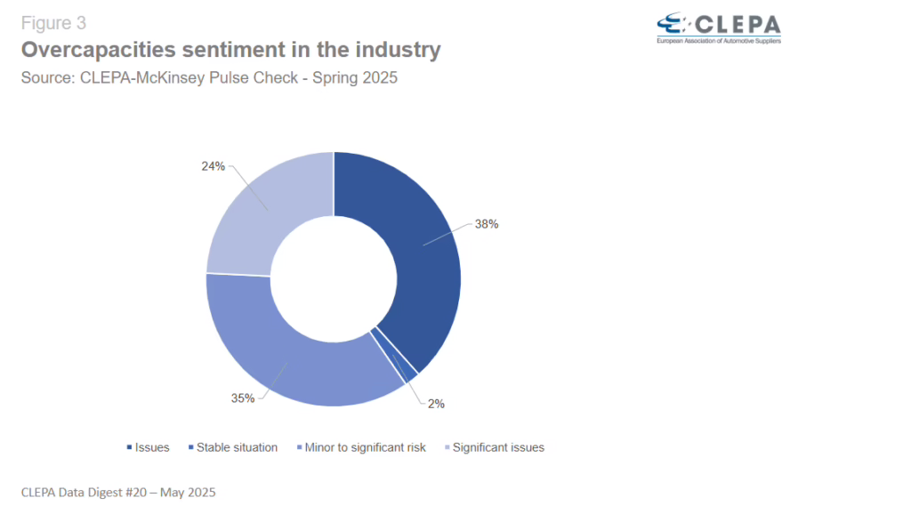 The outlook for the automotive supply industry remains concerning, with 62% of respondents to the latest CLEPA-McKinsey Pulse Check reporting overcapacity and growing fixed costs – conditions that could lead to further downsizing and further job reduction in the near future. One in four companies cite insufficient fixed cost coverage in most of their production facilities at current demand levels. This points to continued pressure on margins and an increased risk of structural adjustment across the sector.